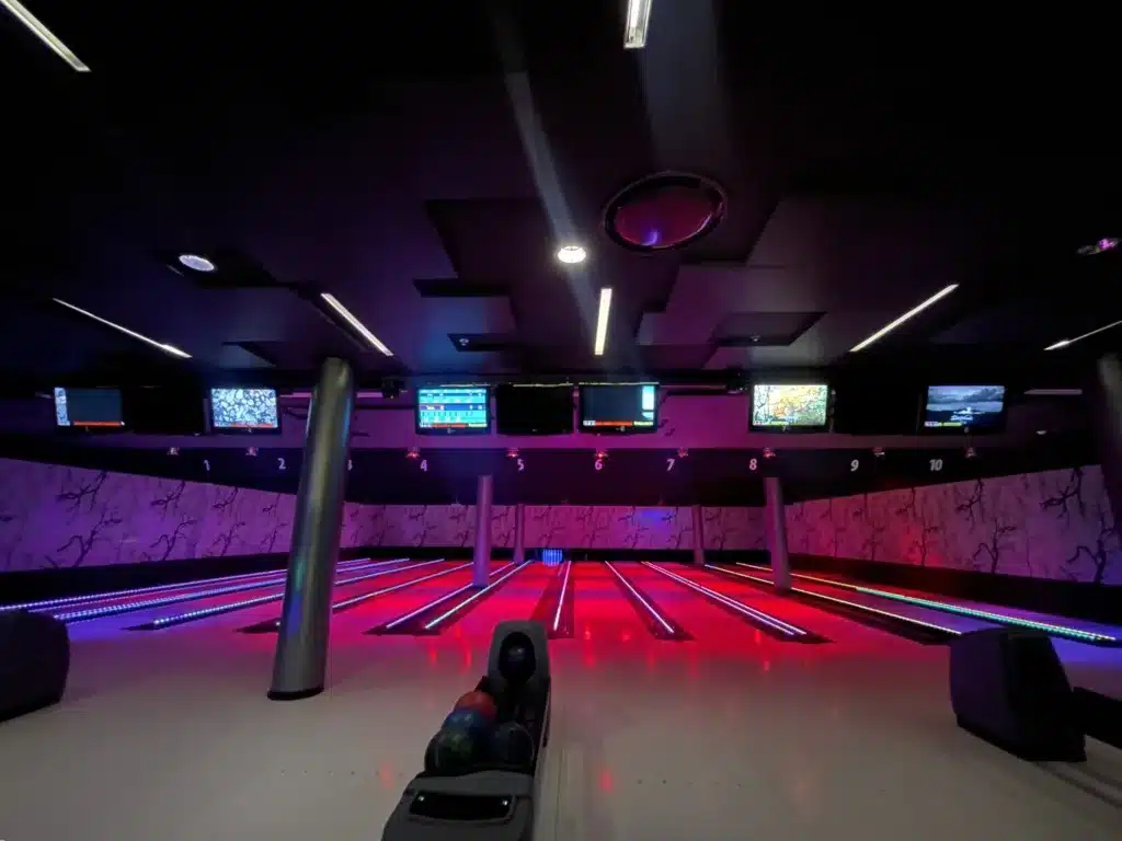 Itse Holiday Club Vierumäki -resortissa on tarjolla day spa, minigolfia, keilausta, pelejä, biljardia sekä kuntohuone. Itse kävimme keilaamassa ja saimmekin koko keilahallin itsellemme, kun muita pelaajia ei ollut. Keilahalli oli alemmassa kerroksessa, eikä sinne(kään) ollut paljon opasteita, ei siis ehkä ihme, ettei tänne ollut moni löytänyt. Me löysimme keilailun nettisivujen kautta, mutta paikan päällä emme keilailusta nähneet yhtään mainosta. Hohtokeilailu oli mukavaa ja niin kengät kuin keilapallotkin olivat erittäin siististi järjestyksessä. Keilaratojen yhteydessä on myös baari. Myös keilarata menee kiinni klo 21, kuten kylpylä, joten yhden päivän reissulla voi joutua hieman aikatauluttamaan, jos haluaa molemmat kokemukset ja ruokailun sujuvasti samaan päivään.