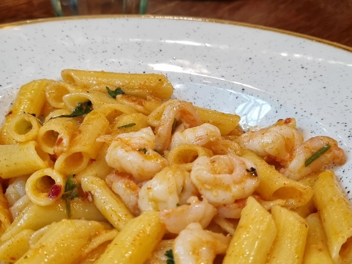 Listalta löytyy alkupalaksi valikoima salaatteja ja pienempiä antipasto-annoksia. Pastaa löytyy listalta 16 erilaista annosta, joita saa myös alkuruokakokoisina. Jälkkärilista on jäätelöpainotteinen. Myös tasting menu on saatavilla yhteensopivilla viineillä. Kokeilin itse gluteenitonta espanjalaisvaikutteista Pilpil-pastaa, eli jättirapupastaa tulisella valkosipuliöljyllä, valkoviinipersiljaliemellä. Annos kuulosti herkulliselta, mutta olisin kaivannut siihen hieman lisää makua – nyt tämä ei täysin lunastanut odotuksia. Ravintolasta oli loppunut annokseen yhteyteen suositeltu valkoviini, joten tämä jäi kokematta. Seuralaiseni puolestaan kokeili normaalista tuorepastasta valmistettua Carbonaraa. Annos oli kuulemma hyvä, mutta hieman liian kuiva.