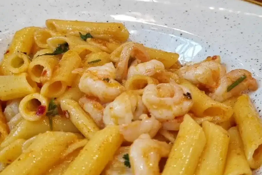 Listalta löytyy alkupalaksi valikoima salaatteja ja pienempiä antipasto-annoksia. Pastaa löytyy listalta 16 erilaista annosta, joita saa myös alkuruokakokoisina. Jälkkärilista on jäätelöpainotteinen. Myös tasting menu on saatavilla yhteensopivilla viineillä. Kokeilin itse gluteenitonta espanjalaisvaikutteista Pilpil-pastaa, eli jättirapupastaa tulisella valkosipuliöljyllä, valkoviinipersiljaliemellä. Annos kuulosti herkulliselta, mutta olisin kaivannut siihen hieman lisää makua – nyt tämä ei täysin lunastanut odotuksia. Ravintolasta oli loppunut annokseen yhteyteen suositeltu valkoviini, joten tämä jäi kokematta. Seuralaiseni puolestaan kokeili normaalista tuorepastasta valmistettua Carbonaraa. Annos oli kuulemma hyvä, mutta hieman liian kuiva.