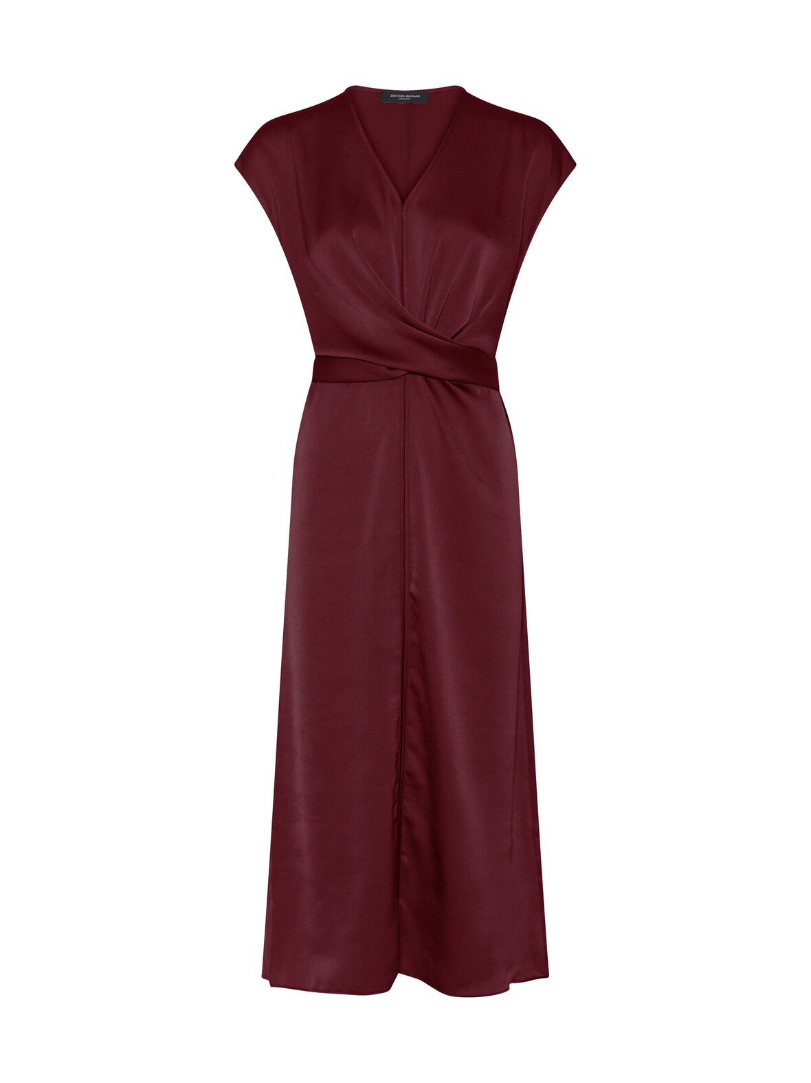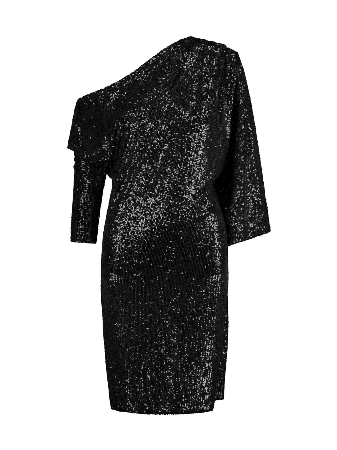 - Yksivärinen olkapäämekko (esim. kimaltava musta tai burgundi)